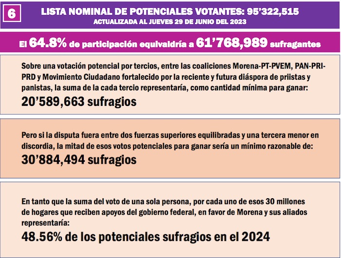 Sobre una votación potencial por tercios, entre las coaliciones Morena-PT-PVEM, PAN-PRI- PRD y Movimiento Ciudadano, fortalecido por la reciente y futura diáspora de priistas y panistas, la suma de cada tercio representaría, como cantidad mínima para ganar: 20 millones 589 mil 663 sufragios.