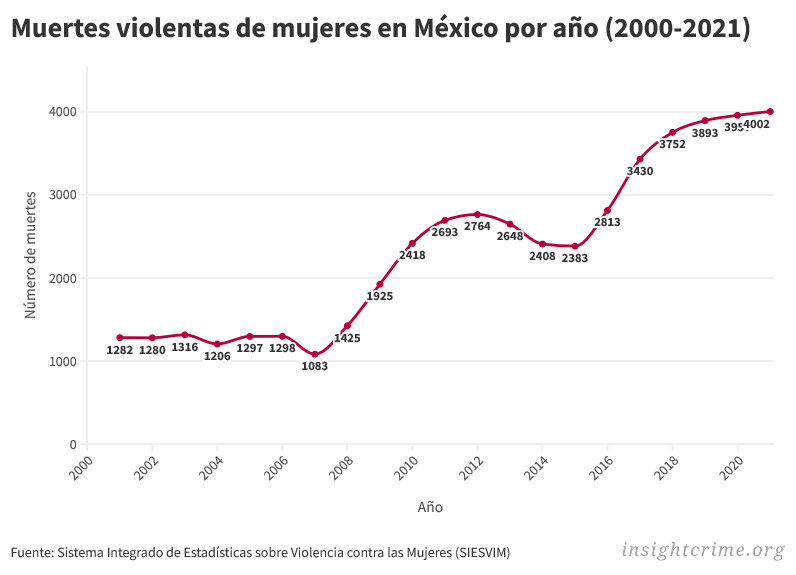 La violencia contra las mujeres en México lleva años de crecimiento sostenido. Entre 2006 y 2021 fueron asesinadas en México cerca de 43 mil mujeres, según cifras oficiales del Sistema Nacional de Seguridad Pública, que también muestran un aumento sostenido del número de feminicidios y homicidios de mujeres año a año.