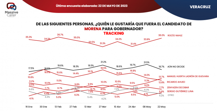 En cuanto a los aspirantes de Morena, Rocío Nahle encabeza holgadamente la encuesta con un 36 por ciento de las preferencias. En segundo lugar, se encuentra el superdelegado Manuel Huerta Ladrón, con un 13.7 por ciento, seguido por el Alcalde de Xalapa, Ricardo Ahued, con un 12.8 por ciento; el Secretario de Gobierno, Zenyazen Escobar, con un 7.7 por ciento, y finalmente el Diputado federal Sergio Gutiérrez Luna, con un 5.9 por ciento.