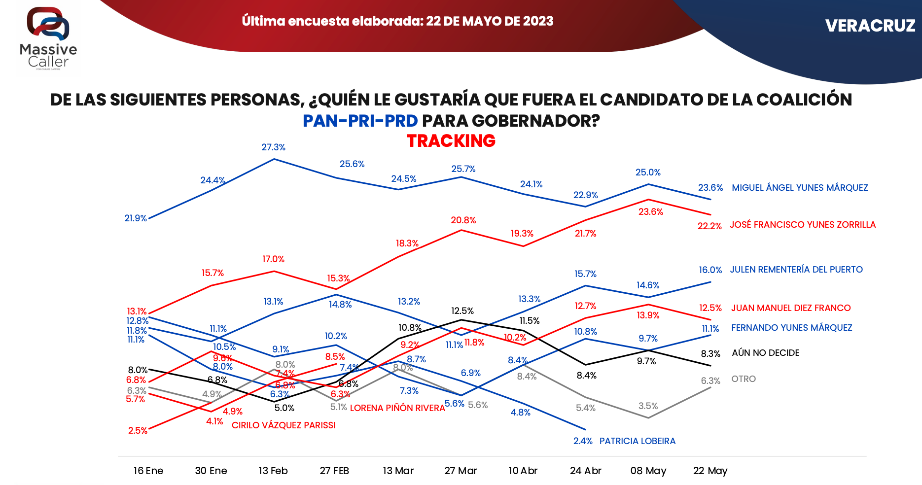 De acuerdo con la encuesta más reciente publicada por la casa encuestadora Massive Caller, elaborada en mayo de 2023, Morena lleva la ventaja en Veracruz con un 45.7 por ciento, mientras que la alianza PRI, PAN y PRD alcanzó un 28.6 por ciento de las preferencias, frente a un 19.3 por ciento de la población que aún no ha decidido.