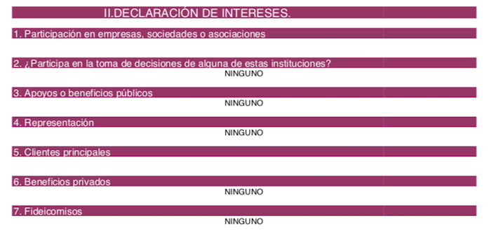 Imagen de su declaración patrimonial como Senadora, en el apartado de Conflictos de Interés. Foto: Captura de pantalla