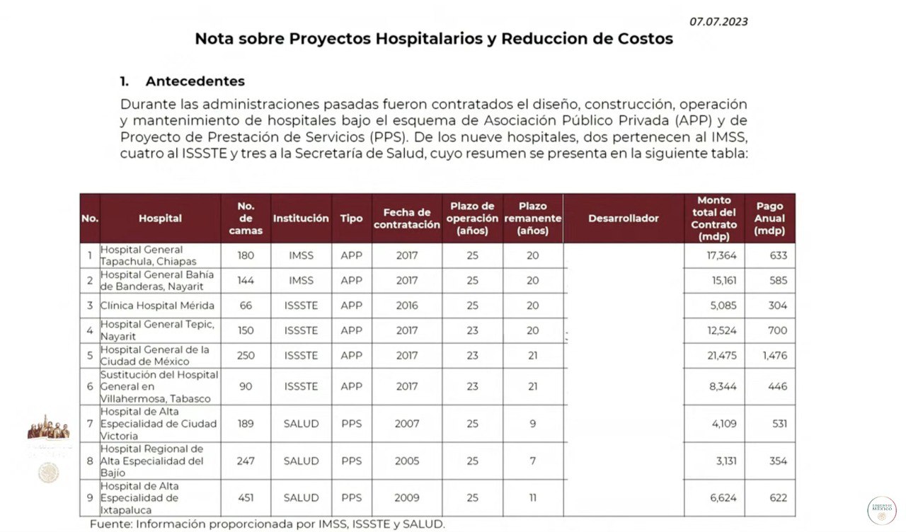 De acuerdo con el Presidente, los contratos fueron entregados durante las administraciones de Felipe Calderón Hinojosa y Enrique Peña Nieto por plazos de entre 23 y 25 años. Además, explicó que el Gobierno tiene una deuda de más de 98 mil millones de pesos para cumplir con los pagos para estos mecanismos de Asociación Público-Privada (APP) y Proyecto de Prestación de Servicios (PPS).