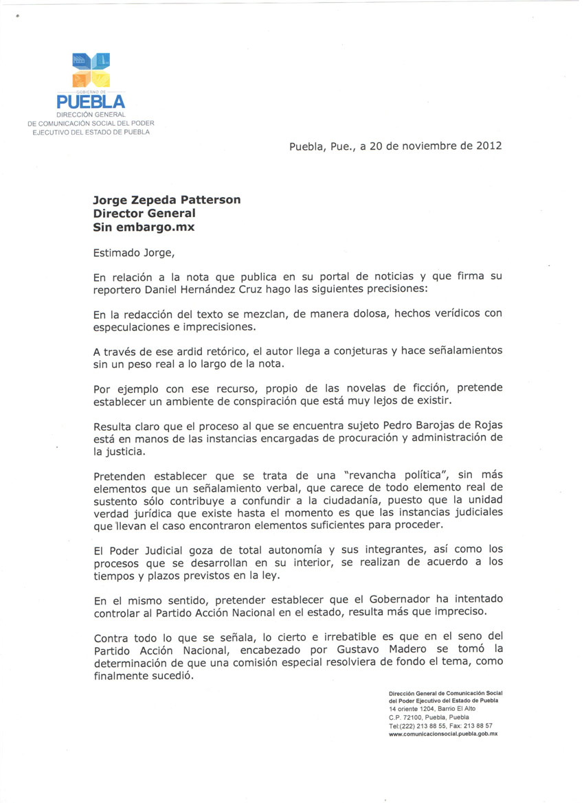 Carta del Gobierno de Puebla a Sinembargo.mx