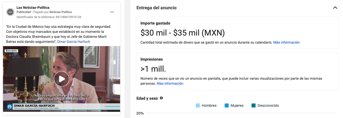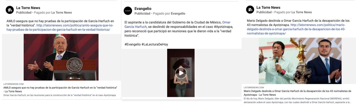 Por ejemplo, las páginas "Capital 4T", "Defendiendo la Democracia Juntos" y "La Torre News" pagaron anuncios donde se destaca que el Presidente Andrés Manuel López Obrador, y el propio exfuncionario, negaron la participación de García Harfuch en el caso Ayotzinapa.