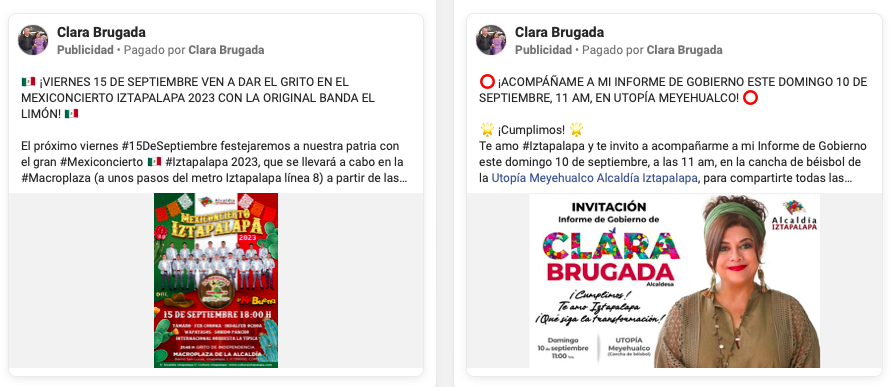 Actualmente, la única persona que ha pagado anuncios es Clara Brugada, quien dio a promover los festejos por el 15 de septiembre a través de su cuenta propia y de su Quinto Informe de Gobierno, con un gasto total de cuatro mil 795 pesos. Aún con ello, el monto total de su promoción en redes sociales a lo largo del año –ya sea por cuenta propia o a través de otras páginas– ha sido de 300 mil 146 pesos.