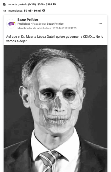 Al igual que García Harfuch, el exsubsecretario de Salud federal, Hugo López-Gatell, ha sido mencionado en publicaciones pagadas en un aspecto negativo. De los 35 anuncios en los cuales se identifica al aspirante, más de la mitad califican desfavorablemente su estrategia durante la pandemia de COVID-19 y su eventual candidatura.