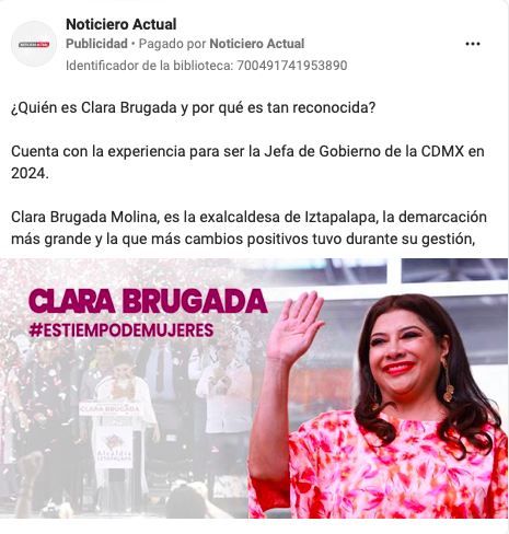 Incluso, la página "Ruido Político", una página que se promueve como un "medio de comunicación/noticias" y fue creada el pasado 25 de septiembre, ha pagado anuncios con las descripciones "Simpatizantes de Clara Brugada fueron captados borrando bardas de Omar García Harfuch. Esta es la desesperación de ir tan lejos del primer lugar en las encuestas" y "Filtran llamada de Clara Brugada, donde admite que Harfuch es el candidato elegido por Andrés Manuel López Obrador; y ordena mover encuestas cuchareadas para favorecerse".