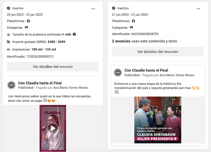 Las otras 23 páginas que pagaron por promover a Sheinbaum Pardo no han sido eliminadas, destaca que 13 de ellas fueron creadas entre el 21 y 23 de abril y el pago de sus anuncios fue atribuido a Maximizando Ideas, una empresa que, según destaca en su sitio web, se enfoca en crecer el impacto de marcas en el mundo digital.