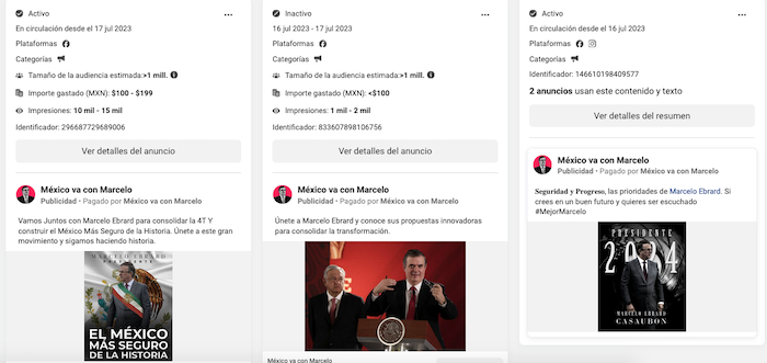 Aunque sólo los senadores con licencia Ricardo Monreal Ávila y Manuel Velasco del Partido Verde Ecologista (PVEM) han pagado por anuncios en sus perfiles oficiales, la y los morenistas Claudia Sheinbaum Pardo, Marcelo Ebrard Casaubón, Adán Augusto López Hernández, y en menor medida el petista Gerardo Fernández Noroña, también son promovidos pero a través de cuentas que utilizan como nombre frases de apoyo, de acuerdo con datos de la Biblioteca de anuncios de Meta.