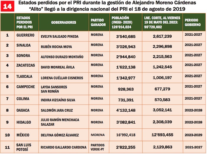 Alejandro Moreno Cárdenas llegó a la presidencia nacional del PRI el 18 de agosto del 2019. En los últimos cuatro años el tricolor ha avanzado con paso firme hacia el abismo, al perder 11 gubernaturas, incluyendo la del Estado de México en junio del 2023. La mísera cuota política para el rico empobrecido son sólo las gubernaturas de Coahuila y Durango.