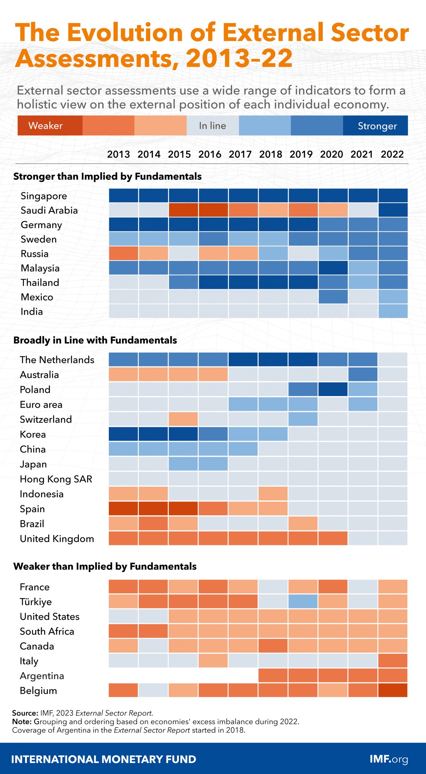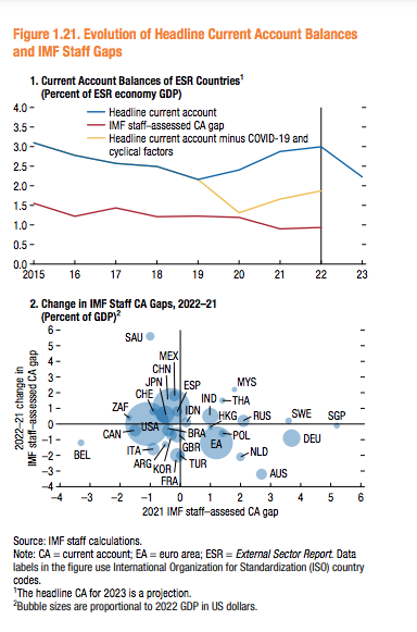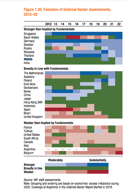 –Moderadamente más fuerte, más fuerte o sustancialmente más fuerte que el nivel consistente con los fundamentos a mediano plazo y las políticas deseables. Las nueve economías con tales posiciones fueron Alemania, Malasia, Rusia, Singapur, Suecia y Tailandia, junto con India, México y Arabia Saudita, que entró en la categoría en 2022.