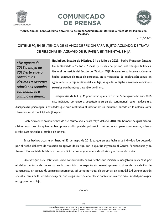 Estado de México, 22 de julio (A Fondo Edomex).-- Pedro Francisco Santiago fue sentenciado a 65 años, 7 meses y 15 días de prisión, una vez que la Fiscalía General de Justicia del Estado de México (FGJEM) acreditó su intervención en el hecho delictivo de trata de personas, en la modalidad de explotación sexual en agravio de su pareja sentimental y su hija, ya que las obligaba a sostener relaciones sexuales con hombres a cambio de dinero.