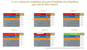 Los seis careos son liderados por un aspirante del partido gobernante y aliados. El primer caso posiciona como la candidata favorita a Claudia Sheinbaum, con 55 por ciento; Xóchitl Gálvez, 25 por ciento; y Luis Donaldo Colosio con siete por ciento. En el segundo se sitúa Marcelo Ebrard a la cabeza con un 54 por ciento de posibilidades de ganar, seguida de un 26 por ciento de Gálvez, y más abajo Colosio Riojas con 11.