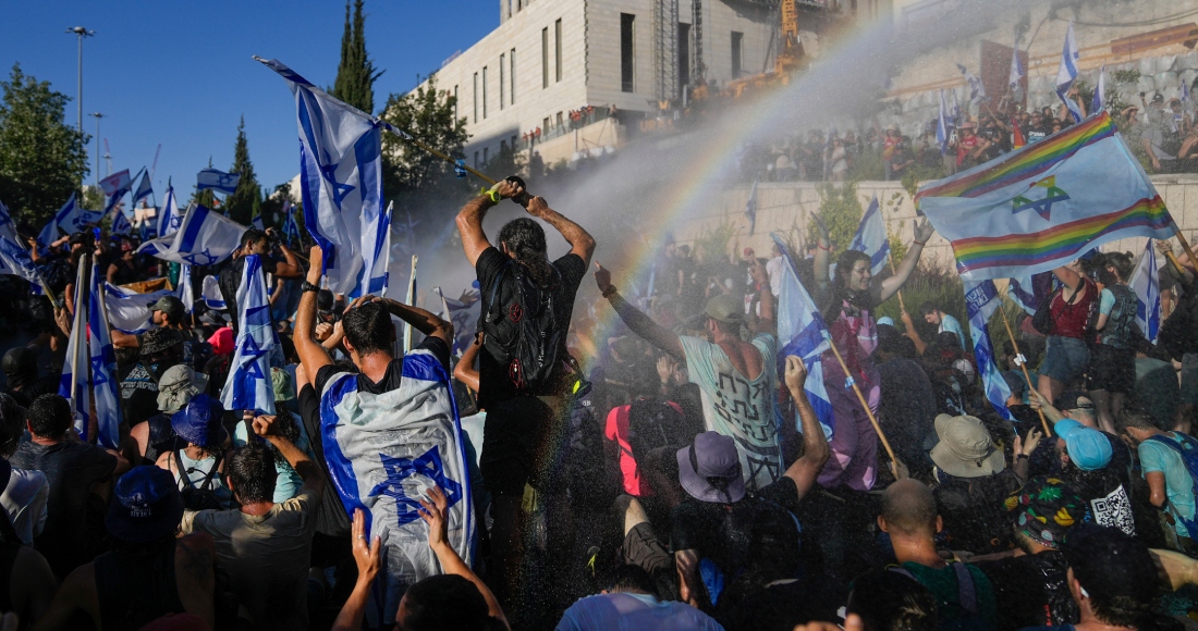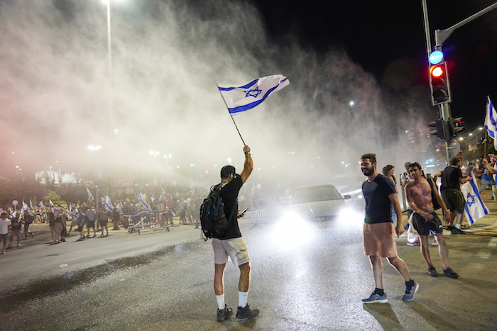 Miles de personas bloquearon la carretera principal de Jerusalén después de la votación. Las paredes y vallas a lo largo de la calle frente a la Corte Suprema, la oficina del Primer Ministro y el Parlamento estaban cubiertas con cientos de pegatinas que decían “no serviremos a un dictador”, “democracia o rebelión” y “salvaremos a Israel de Netanyahu”. La policía trató de despejar a la multitud con cañones de agua que rociaban líquido con olor a mofeta.