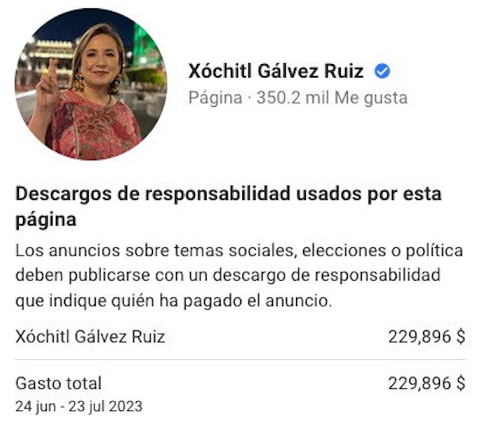 Para promocionar a la Senadora Xóchitl Gálvez se pagó en un mes 229 mil 896 pesos por 89 anuncios publicados en sus perfiles oficiales de Facebook e Instagram.