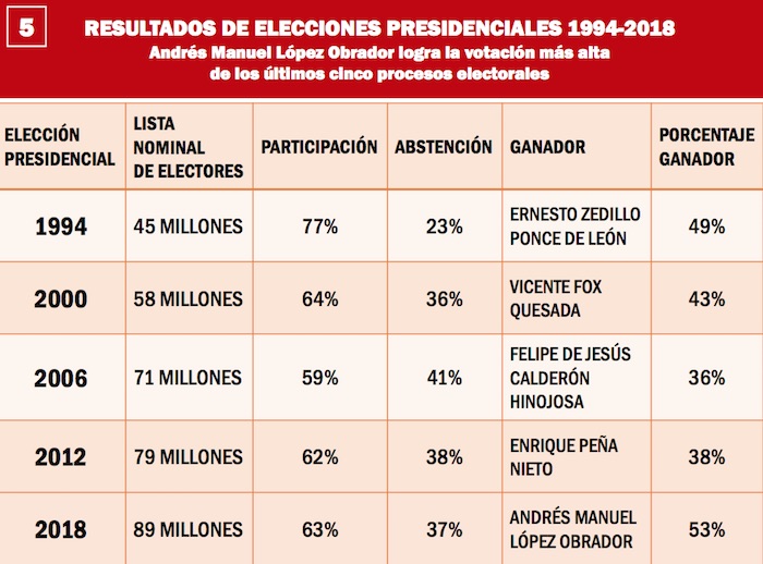 A manera de perspectiva, en los últimos cinco procesos presidenciales en los que resultaron electos, respectivamente, Ernesto Zedillo Ponce de León, Vicente Fox Quesada, Felipe Calderón Hinojosa, Enrique Peña Nieto y Andrés Manuel López Obrador, este último es el único en que superó el 50 por ciento de la votación.