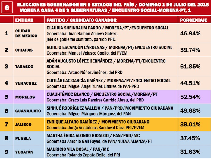 En esos comicios el partido guinda ganó 256 diputaciones federales y 59 posiciones en el Senado de la República. En tanto, el Partido del Trabajo sumó 28 diputados a la alianza y Encuentro Social otros 30 y de esa manera el oficialismo pudo alcanzar la mayoría calificada necesaria para modificar la Constitución y echar a andar el proyecto de Gobierno de López Obrador.