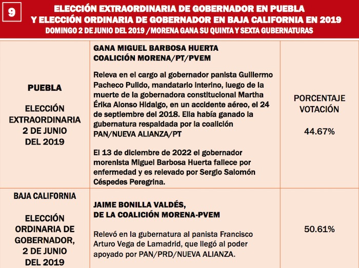 Ahora bien, en el año 2019, hubo una elección extraordinaria de Gobernador en Puebla a raíz del fallecimiento de la Gobernadora Martha Érika Alonso Hidalgo en un accidente aéreo ocurrido el 24 de diciembre de 2018. Por lo tanto, el 2 de junio de 2019 hubo una nueva votación en la que ganó Miguel Barbosa Huerta; ese mismo día, en Baja California, ganó Jaime Bonilla.