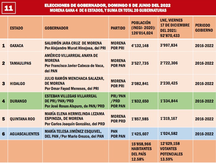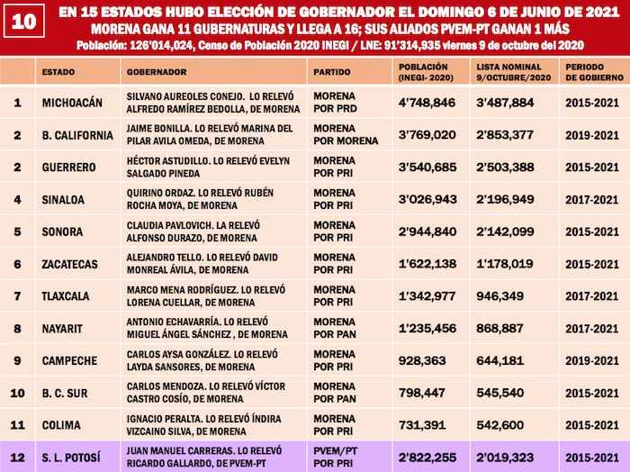 Dos años después, en 2021, hubo elecciones en 15 estados de la República, en los cuales Morena triunfó en 11: Michoacán, Baja California, Baja California Sur, Colima, Guerrero, Sinaloa, Sonora Zacatecas, Tlaxcala, Campeche, Nayarit y llegó a 16 entidades en su poder, más San Luis Potosí en la que obtuvieron el triunfo sus aliados el PT y el Partido Verde. En 2022, al renovarse seis gubernaturas, el partido guinda ganó en cuatro estados: Hidalgo, Oaxaca, Quintana Roo y Tamaulipas.
