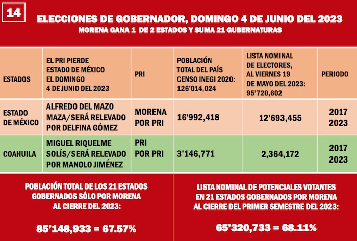 Apenas el 4 de junio de 2023, Morena triunfó en el Estado de México con lo cual ahora gobierna, junto a las entidades conquistadas por sus aliados, una población de más de 85 millones de mexicanos así como de 65 millones de posibles votantes.