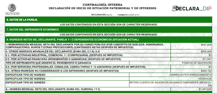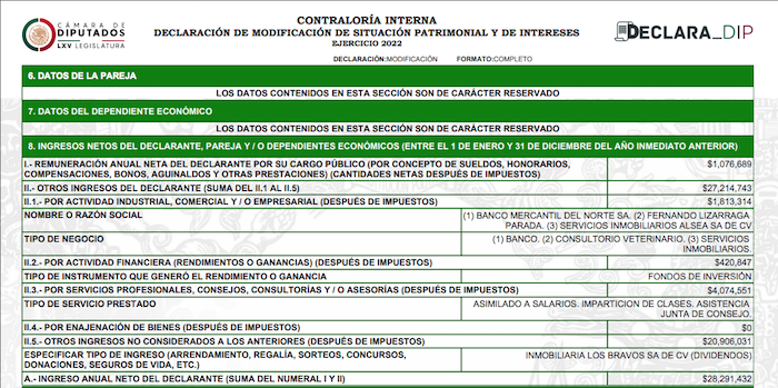 En los documentos oficiales que presentó ante la contraloría de la Cámara de Diputados, el Diputado reporta que sus ingresos crecieron mientras que en el apartado en donde debe explicar el origen del dinero no detalla en su totalidad de dónde provienen los millones.