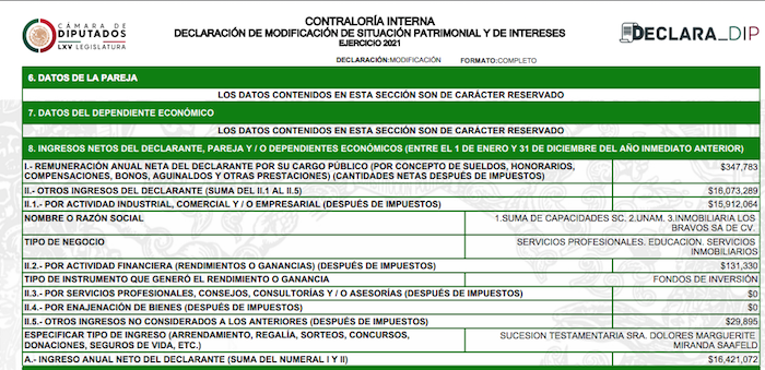 La siguiente declaración disponible es la de 2021 en donde Creel reporta ingresos anuales ahora por 16 millones 421 mil 072 pesos. En este caso la menor cantidad de dinero la obtuvo de su cargo público; los millones vinieron de los negocios de la empresa Servicios Inmobiliarios Alsea; otro tanto por actividad financiera y 29 mil 895 pesos por herencia de su madre Dolores Miranda Saafeld.