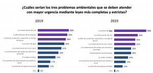 En la encuesta del 2023, la escasez del agua fue mencionada por el 53 por ciento de las personas a nivel nacional. La segunda preocupación ambiental, la contaminación del aire, siguió en los mismos niveles: 39 por ciento, pero en cambio la falta de agua creció 17 puntos porcentuales desde entonces, y provocó que las otras preocupaciones, aunque presentes, ya menos prominentes que en años anteriores.
