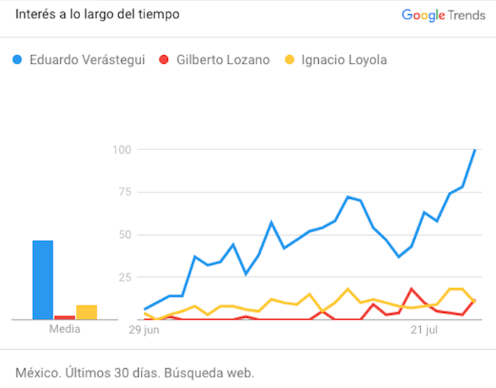 Por ejemplo, del 28 de junio al 24 de julio, las tendencias de búsqueda del actor crecieron de 11 a 100 en una escala donde el 100 representa el máximo valor, su nombre también se consultó junto al título de la película que recientemente estrenó en Estados Unidos. Mientras que del 20 al 24 de julio las tendencias de búsqueda del panista Loyola aumentaron de cero a 16.