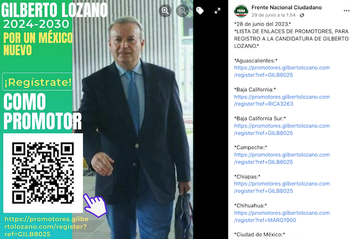 “Vamos por un México Nuevo. Gilberto Lozano 2024-2030”, señala una imagen compartida esta semana en Facebook desde el perfil “Frente Nacional Ciudadano”. Mientras que en Twitter lo describen como un “candidato independiente, no con lazos de carteles políticos y crimen organizado”.