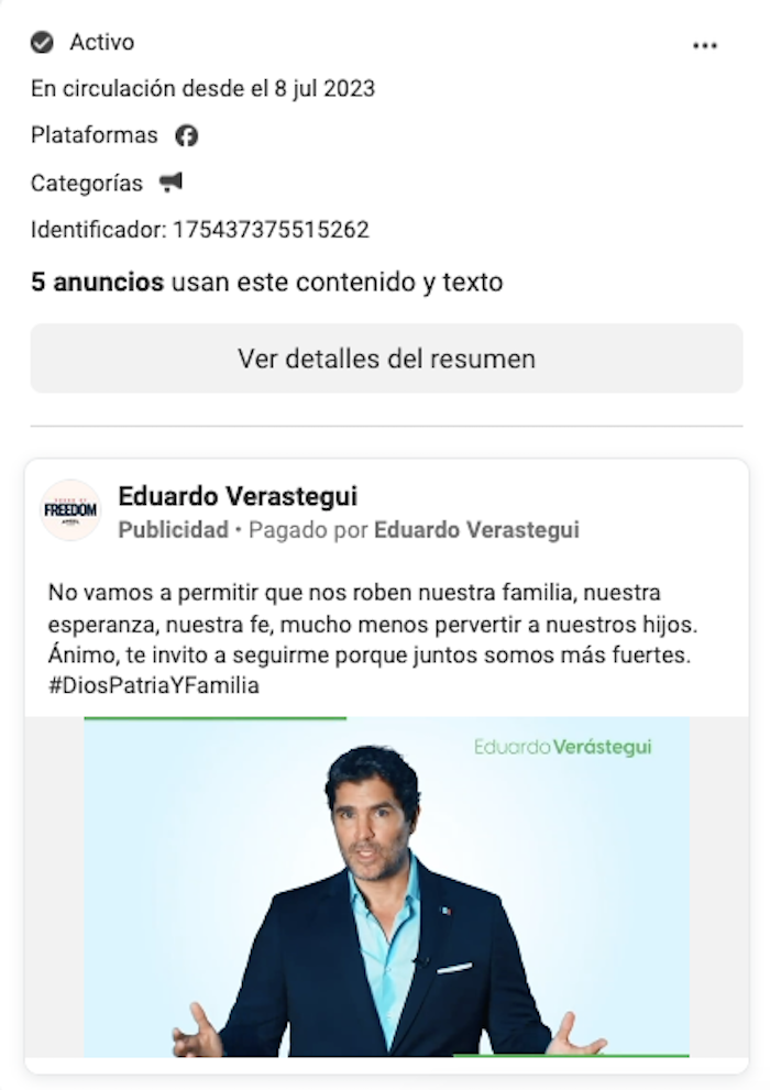 El caso de Eduardo Verástegui destaca porque de inicios de junio hasta el 27 de julio gastó 82 mil 217 pesos en promocionarse desde sus perfiles de Facebook e Instagram, de acuerdo con la Biblioteca de anuncios de Meta. En las publicaciones pide respaldar al Movimiento Viva México, fundado por él en 2019 y que está en contra de derechos como el aborto y la agenda de la comunidad LGBTIQ+.