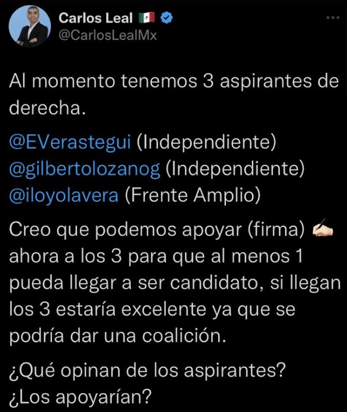 —En Twitter, el político Carlos Leal lo destapó como precandidato presidencial del sector conservador junto con Eduardo Verástegui y Gilberto Lozano de FRENA. ¿Ha tenido pláticas con ellos más allá de Twitter para una eventual candidatura de la ultraderecha?