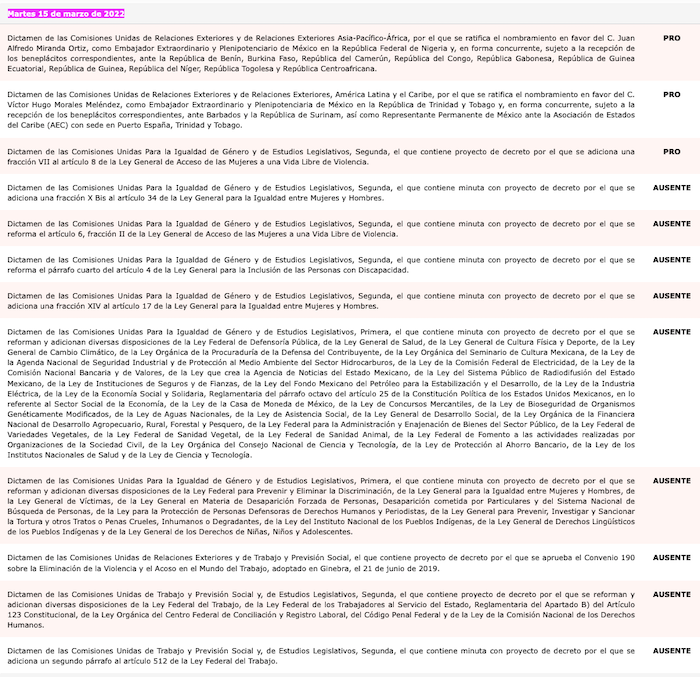 El 15 de marzo de 2022 Paredes Rangel se ausentó de 9 de las 12 votaciones. Foto: Captura de pantalla Votaciones del Senado.