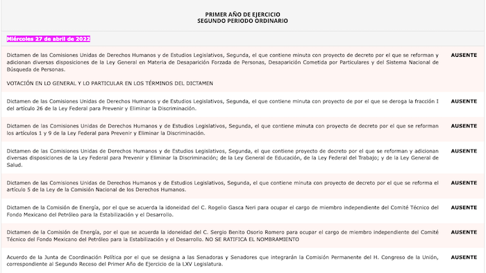 El 27 de abril de 2022, la Senadora Xóchitl Gálvez se ausentó de las ocho votaciones programadas pero no justificó sus faltas. Foto: Captura de pantalla Votaciones del Senado