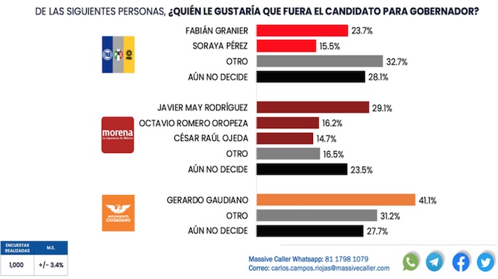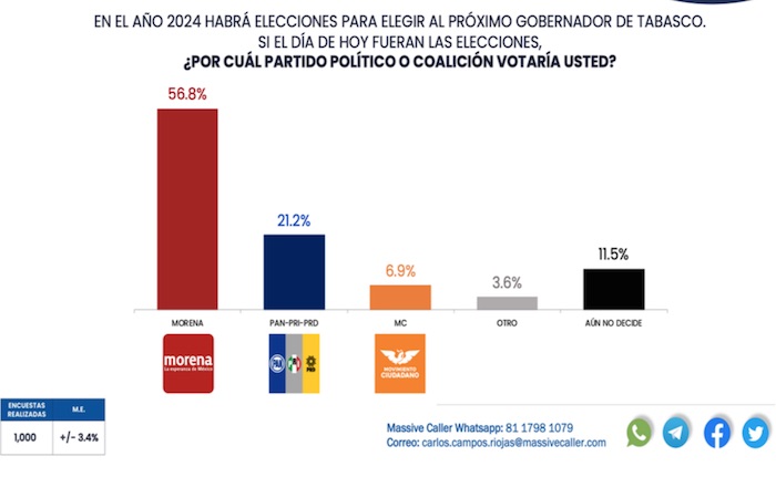 De cara a 2024, Massive Caller señala que Morena tiene una preferencia de 56.8 por ciento para la elección a Gobernador del próximo año; el PAN-PRI-PRD, 21.2 por ciento, y Movimiento Ciudadano, 6.9 por ciento.