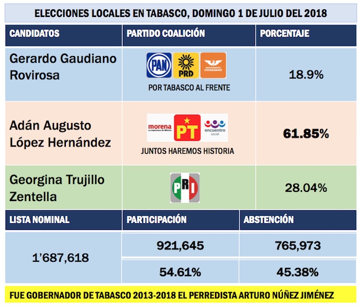 En la elección pasada de 2018, Adán Augusto López Hernández, abanderado de Morena-PT-PES, ganó en Tabasco con el 61.58 por ciento de la votación, seguido de la priista Georgina Trujillo Zentella, que logró el 28.04 por ciento de la votación, y Gerardo Gaudiano Rovirosa, candidato del PAN-PRD-Movimiento Ciudadano, que alcanzó el 18.9 de los respaldos.