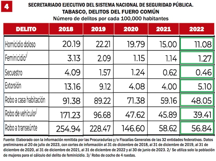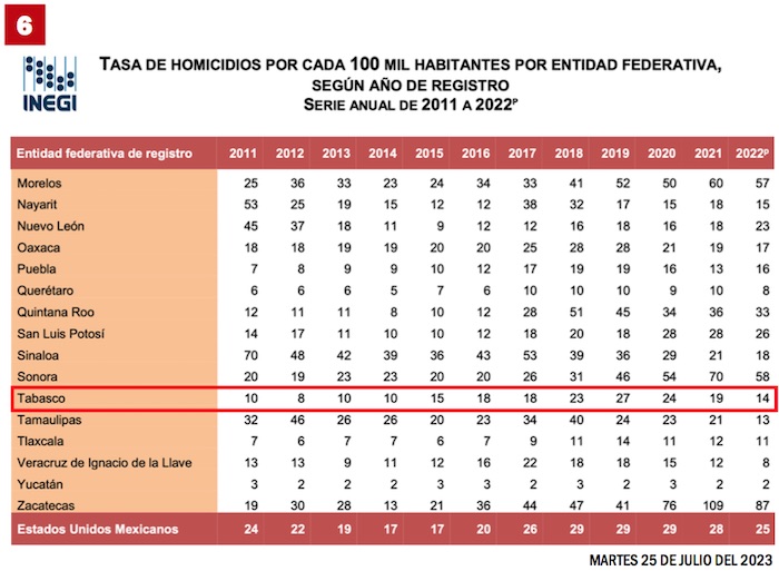 En cuanto a la tasa de homicidios, las cifras del INEGI revelan que pasó en 2018 de 23 asesinatos por cada 100 mil habitantes a 14 al cierre del 2022.