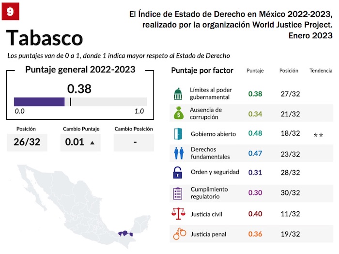 No obstante, los niveles de impunidad en el estado son altos. El Índice Global de Impunidad México 2022, que elabora la Universidad de las Américas Puebla, muestra que 58.99 delitos de cada 100 quedan impunes en Tabasco. Con respecto al Índice de Estado de Derecho en México 2022-2023, realizado por la organización World Justice Project, éste es de 0.38, en una escala de 0 a 1, mucho menos de la mitad, lo cual lo coloca en la posición 26 de los 32 estados.