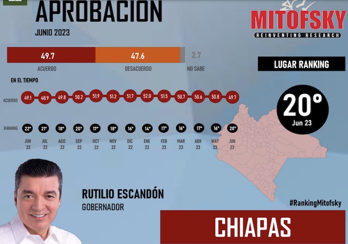 Respecto a la aprobación del Gobernador Rutilio Escandón, Mitofsky lo coloca con un 49.7 por ciento que lo posiciona en el lugar 20 a nivel nacional. En tanto Massive Caller lo coloca como uno de los mandatarios con menor aprobación, al ubicarlo en el lugar 30. Según estos mismos números, el mandatario tiene una aprobación menor a la del Presidente Andrés Manuel López Obrador en el estado que es del 61.8 por ciento.