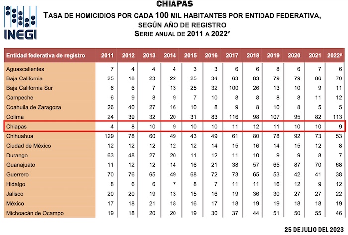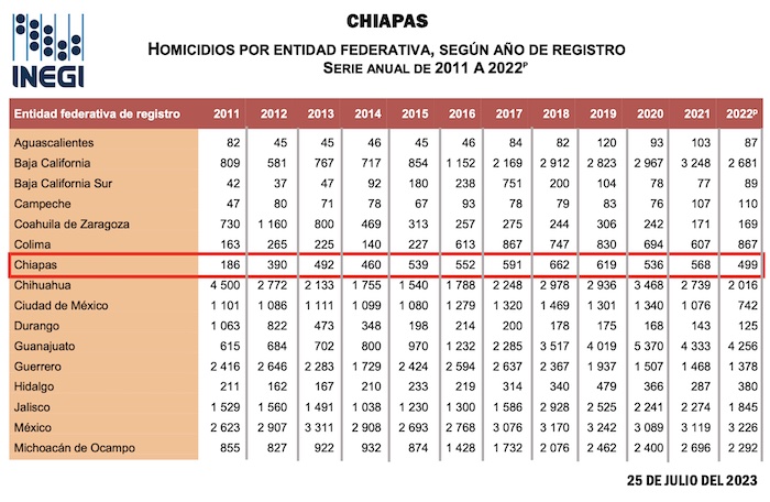 Con respecto a homicidios en números absolutos, en 2018, cuando Rutilio Escandón tomó posesión, se contabilizaron 662 caos en la entidad, para 2022 la cifra descendió a 499. En cuanto a la tasa, esta también sufrió una reducción al pasar de 12 homicidios por cada 100 mil habitantes en 2018, a 9 en 2022.
