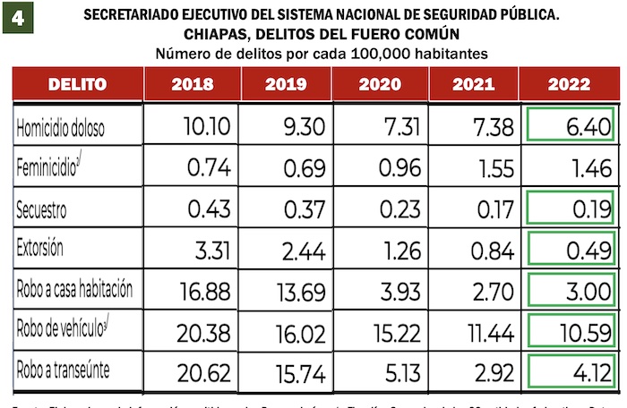 En materia de seguridad, de acuerdo con datos del Secretariado Ejecutivo del Sistema Nacional de Seguridad Pública, (SESNSP), los feminicidios en la entidad han registrado un incremento respecto a 2018, pues pasó de 0.74 casos por cada 100 mil habitantes a 1.46 casos en 2022. En el resto de los ilícitos —homicidio doloso, secuestro, extorsión, robo a casa habitación, robo de vehículo y robo a transeúnte— se han registrado mejoras.