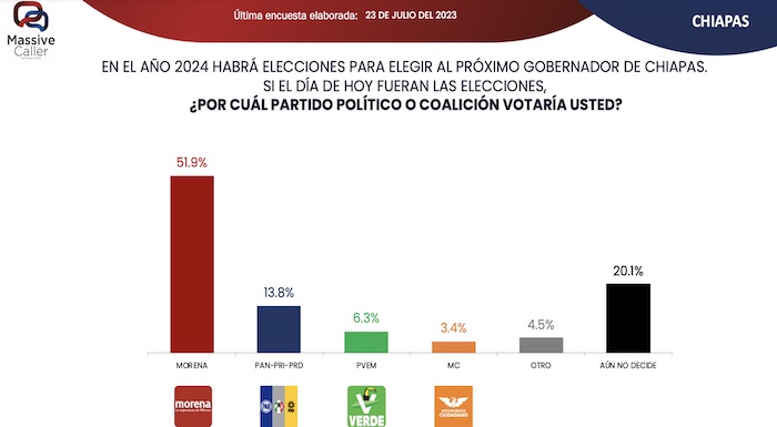 De cara a los comicios del próximo año, Morena encabeza las preferencias del voto con el 51.9 por ciento, en segundo lugar y muy por debajo del partido oficialista está el PAN con el 13.8 por ciento, seguido del Partido verde con el 6.3 por ciento y Movimiento Ciudadano con 3.4 por ciento.