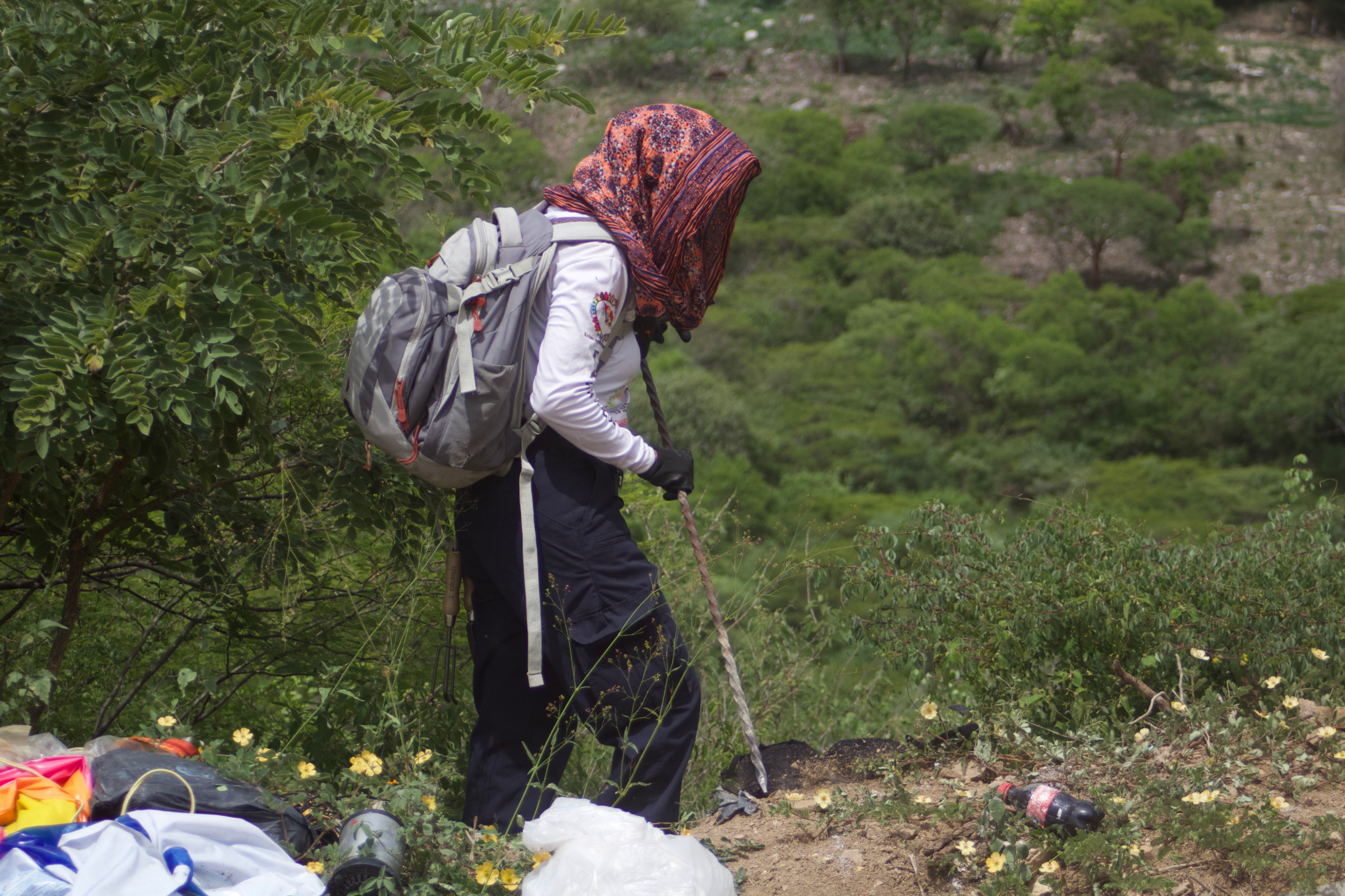 Ellas saben cómo meter la varilla de metal que cargan en el cerro dentro de pedazos de tierra para ver si sale un olor a metano, aquello que indicaría un posible hallazgo. Caminan entre pedazos de huesos que han quedado varados entre envases de plástico y prendas de ropa con hoyos. Los levantan, toman un vistazo a la porosidad y al tamaño. "Es de res". "Es de puerco". "Es de pollo". Ninguno de humano.