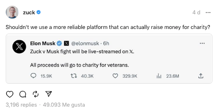 Cualquiera que sea el caso, habrá que espera que Elon Musk y Mark Zuckerberg revelen más detalles sobre su próximo “combate en jaula” y, por supuesto, el verdadero destino de las ganancias que se generarán con éste.