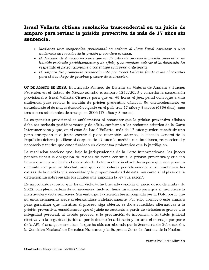 De acuerdo con el comunicado que mantiene la consigna #IsraelVallartaLibreYa, la suspensión provisional obtenida este lunes es emblemática pues reconoce que le prisión preventiva oficiosa debe ser revisada periódicamente y de oficio. En el caso de Israel, más de 17 años pueden constituir una pena anticipada si el juicio excede el plazo razonable.