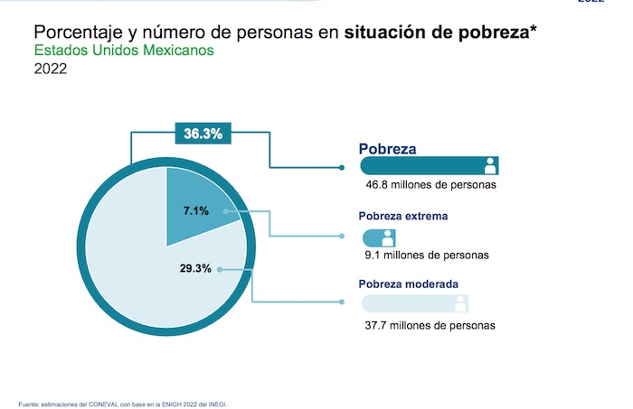 De acuerdo con los datos presentados por el Consejo Nacional de Evaluación de la Política de Desarrollo Social (Coneval), el 36.3 por ciento de la población vive en condiciones de pobreza, es decir, 46.8 millones de personas. La cifra es menor a la reportada dos años antes, presentada en la etapa más compleja de la pandemia, en donde se contabilizó a 55.7 millones de personas en pobreza.