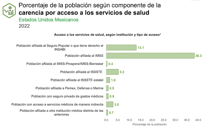 El otro indicador que resaltó fue el de acceso a los servicios de salud. Los números muestran que, de 2020 a 2022, la cantidad de personas que reportaron contar con ese derecho pasó de 28.2 por ciento a 39.1 por ciento; en 2015, la cifra era de 15.5 por ciento.