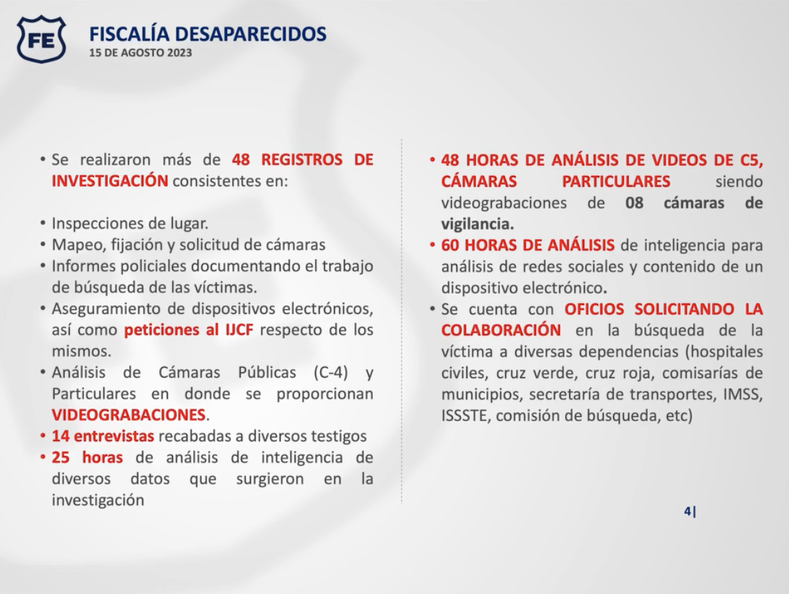 El Fiscal informó que se han realizado más de 48 registros de investigación, consistentes en: iInspecciones de lugar; mapeo, fijación y solicitud de cámaras; informes policiales documentando el trabajo de búsqueda de las víctimas. aseguramiento de dispositivos electrónicos; videograbaciones; 14 entrevistas recabadas a diversos testigos; y 25 horas de análisis de inteligencia de diversos datos que surgieron en la investigación.