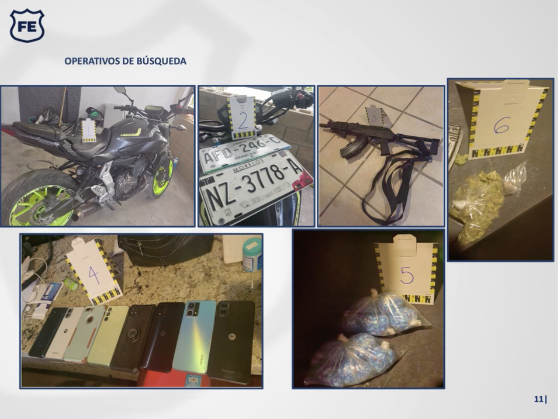 Ese fue el caso de una propiedad, una casa, que fue cateada, ya que las autoridades fueron alertadas por estar posiblemente involucrada con el caso de los 5 jóvenes desaparecidos. En este sitio se hallaron placas de autos, droga y otros artículos, como una motocicleta negra sin placas; armas de fuego 762 y 39mm, así como tres cargadores; 8 celulares móviles; 2 envoltorios de plástico transparentes conteniendo en su interior cada uno pellizcos con polvo blanco; un envoltorio de plástico que contiene vegetal verde y seco; mochila con 15 envoltorios conteniendo en su interior cada uno pellizcos con polvo blanco; 22 bolsas de plástico con vegetal verde y seco.
