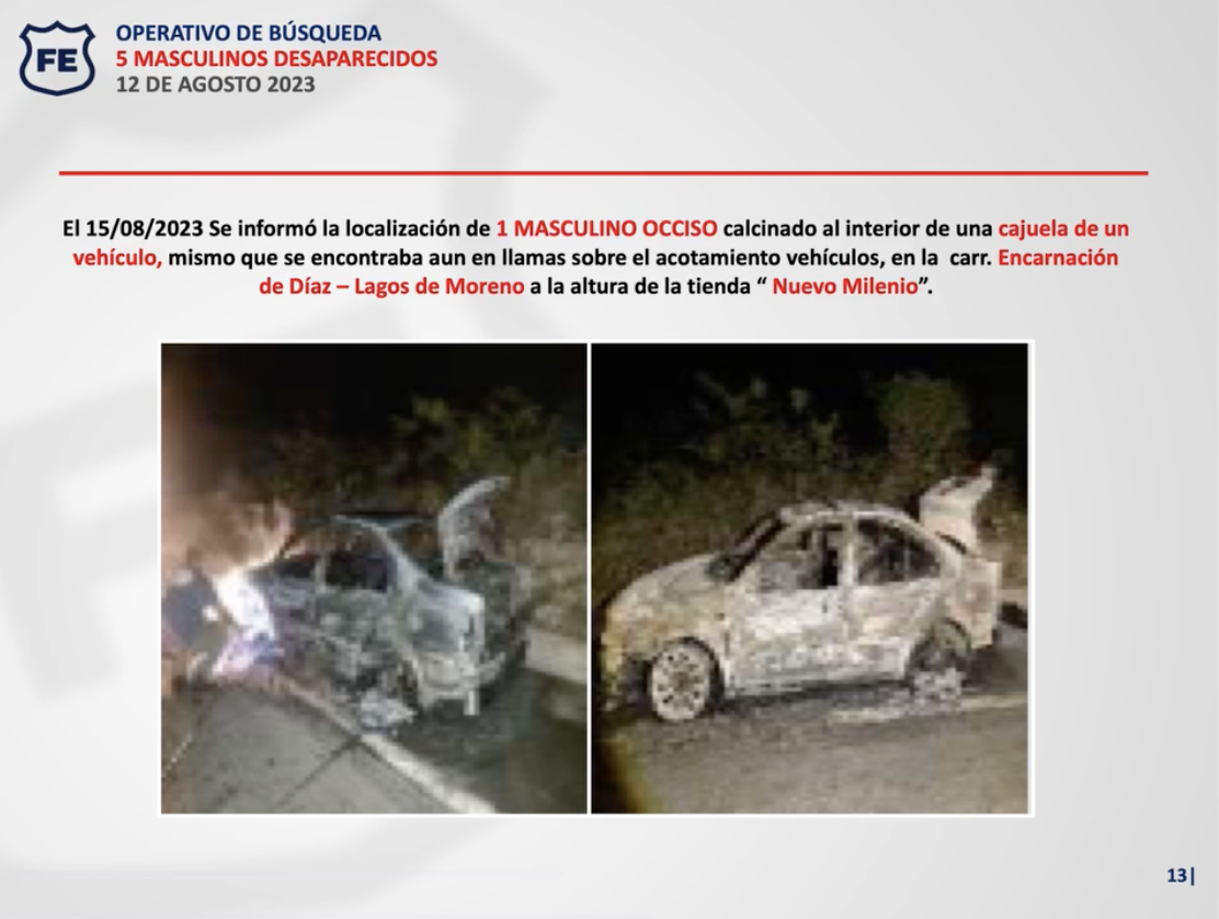 Al interior del vehículo "se localizaron restos que se presumen humanos", detalló el Fiscal. "El automóvil reúne las características de una de las víctimas, se localizó la placa que coincide con la serie identificada y reportada por los familiares". El jueves, la FGE había informado que habían hallado un primer auto de otra de las víctimas.