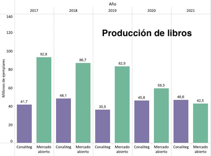 Los propios datos de la CANIEM muestran que en 2021 produjeron para la Conaliteg 46.6 millones de ejemplares de libros de texto gratuito, lo que implicó mil 777 millones de pesos respecto a los 7 mil 342 millones de pesos que obtuvo del mercado abierto. Aunque su principal canal de distribución había sido el Gobierno en los últimos años.